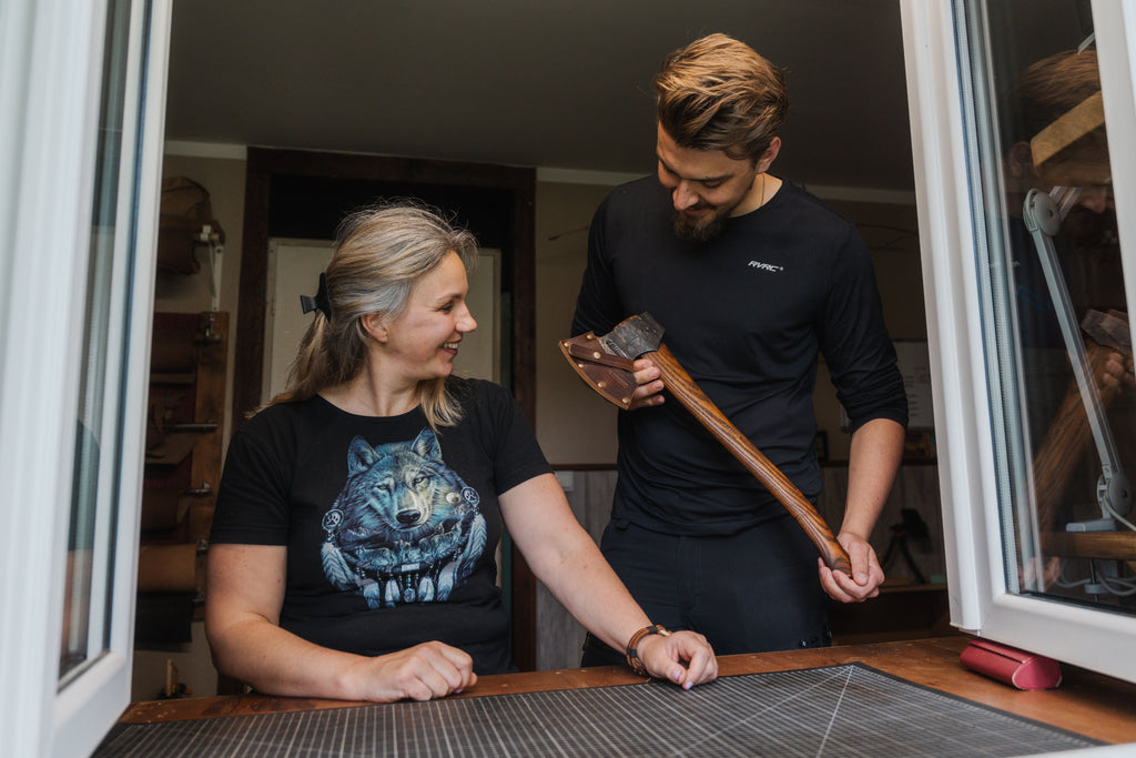 Dace creates the leather sheaths in her quiet home studio. From thick 5mm hides she cuts, stitches and molds each sheath by hand. This gives the axe both protection and character.